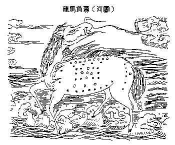 相傳三皇(伏羲、神農、黃帝)時代,有龍馬負圖出於孟津,馬高六尺四寸,長七尺二寸,龍首、馬身、獅尾、牛蹄、足生飛毛、脅生肉翅,背上毛莖迴旋,馬背上有如星點構成的圖案,稱之為河圖。