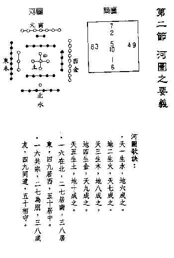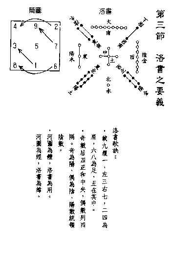 四、紹康成引《春秋緯》云:「河以通乾出天苞,洛以流坤吐地符,河龍圖發,洛龜書成,河圖有九篇,洛書有六篇。」此九六圖書並末流傳後世,僅是相傳上古時代,有龍馬負圖出於黃河,因名河圖:大禹治水,有神龜負文出現於洛水,故名洛書。又因河圖洛書所顯示之圖形及數列與《易經》八卦數理相合,而有八卦從目書出之說。.....回最前