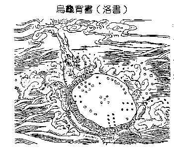 相傳堯虞舜時代,洪水氾溫,命大禹治水,當洪水治平後,在陝西維南縣之洛水發現神龜,血背上刻著黑白九數的幾何圖形。九個白點靠近頭部,一個白點居尾部,三個白點在左脅,七個白點在右脅,四個黑點靠近左眉,二個黑點靠近右眉,六個黑點靠近右足,八個黑點靠近左足,五個白點在背中央。