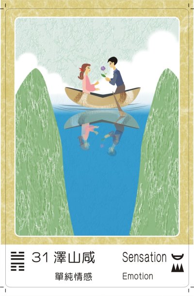 咸:感、感情,表男女相感應、感動,主吉象。有如青春男女,兩小無猜清純無暇的感情,彼此心心相印有感而發的一種情感,得此卦與感情會有非常大的關係。